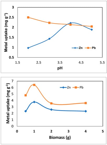 Figure 1 shows the influence of initial biomass amount on Streptomyces sp.’s equilibrium metal uptake of both Zn2+ and Pb2+ metal solution. For both Zn2+ (3.76 mg g−1) and Pb2+ (6.41 mg g−1) at pH 4 and 25 mg L−1 metal concentration, the greatest equilibrium uptakes were seen at 1 g biomass. Higher densities of binding sites may interfere with one another, which could explain this. The higher metal-to-biosorbent ratio at 1 g of Streptomyces sp. biomass may be the cause of the higher metal sorption, which decreases when the biomass amount is raised [].
