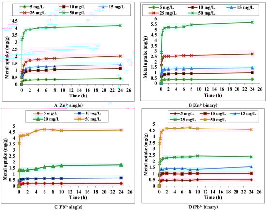 The relationship between the initial Zn2+ and Pb2+ concentrations and the equilibrium metal absorption of Streptomyces sp. for both single and binary metal biosorption systems was investigated. The amount of Streptomyces sp. used in this study was 0.25–4 g. Similar outcomes for Cd (II) removal were reported by [], employing cuttlebone and the alga Anabaena sphaerica, respectively. The biosorption process is facilitated by the higher thrusting force caused by the increasing variations in metal concentration between the cell surface and the bulk solution [].