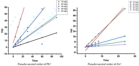 A quick approach typical of employing non-living biomass was used for the biosorption of zinc and lead onto the Streptomyces sp. One of the most crucial aspects of studying biosorption mechanisms and designing adsorption systems is estimating the biosorption rate for a specific system []. In the present investigation, the kinetic experimental data were meticulously scrutinized using an array of mathematical models to discern and characterize the distinct biosorption mechanisms operating within each system. The evaluation of the correlation coefficients (R2) pertaining to the pseudo-first order kinetic constants revealed their comparative diminution in relation to those obtained from alternative kinetic equations (as depicted in Table 5). The experimental sorption data exhibiting correlation coefficients surpassing the notable threshold of 0.999 demonstrated the most conspicuous alignment with the pseudo-second order kinetic model (Figure 3) []. The pseudo-second order equation has an R2 coefficient of 0.999, which is the best fit for zinc and lead. The results indicate that the pseudo-second order binding mechanism predominates, and the zinc and lead are adsorbed on the Streptomyces sp. adsorbent via a chemisorption step.