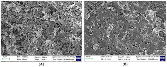 A well-known microscopy technique called scanning electron microscopy (SEM) is increasingly employed to study biological samples and other types of microscopic particles. SEM micrographs of Streptomyces sp. exposed to heavy metals were taken to identify morphological alterations in its biomass. The results of the SEM study confirmed that adding heavy metals had a detrimental effect on the biomass of Streptomyces sp. as shown in Figure 4. An SEM analysis of the biomass surface revealed that it is porous and compatible with good metal uptake capacity []. Figure 4B shows the formation of a thick, assembled heavy metal attachment to Streptomyces sp. surface, as well as the buildup of heavy metal molecules inside the porosity structure.