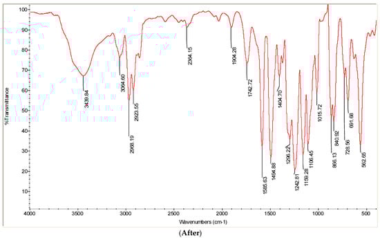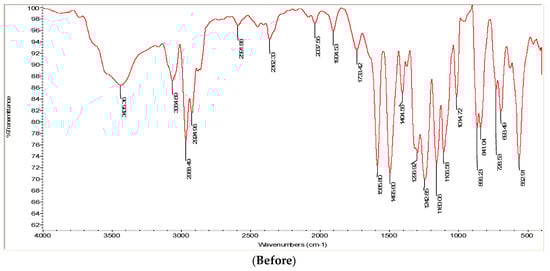 An FTIR (Fourier transform infrared) analysis was employed to elucidate the assortment of functional groups existing before and after on the surface of the generated biomass. Spectra within the range of 4000–450 cm−1 were subjected to examination with a resolution of 4 cm−1. As reported by [], the IR spectra of the compound exhibited distinctive bands at specific wavenumbers: 3435, 3064, 2968, 2924, 2591, 2362, 1904, 1733, 1106, and 562 cm−1. These bands were indicative of the presence of primary amine, hydroxyls, alkenes, primary amide, and carbonyl groups (Figure 5). Notably, the surface of Streptomyces sp. displayed the presence of carboxyl and carbonyl groups, which could potentially contribute to the binding of heavy metals []. Furthermore, the investigation revealed that carboxyl, amino, amide, and hydroxyl groups predominated within the structural composition of Streptomyces sp. While an alkane is responsible for a high peak at 3064 cm−1, an O-H stretching vibration is responsible for one at 3435 cm−1. Figure 5 (after) demonstrates the shift in the position of these bands during heavy metal adsorption, demonstrating the active involvement of the assigned functional groups. The appearance of the primary peaks associated with raw Streptomyces sp. at 1733 and 1586 cm−1 indicates the presence of a large number of aliphatic, aromatic, and nitro compounds []. The peaks are brought on by ring C-C stretching, nitro compound N-O stretching, and aliphatic/aromatic amine C-N stretching []. The fact that the characteristic peaks in the FTIR spectra barely moved indicates that Streptomyces sp. were successful in absorbing heavy metals. Chemical adsorption between the functional groups of Streptomyces sp. and the heavy metals is evident from FTIR measurements.