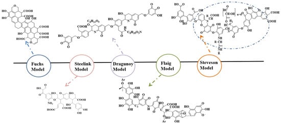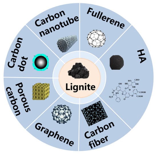 Given the fundamental national conditions in China, where fossil energy dominates, accelerating the research, development, and widespread application of clean and efficient utilization technologies for fossil energy has become a new trend in energy transformation. Coal-based material utilization has emerged as a key aspect of this transition. Lignite, a type of coal rich in organic matter, has historically been primarily used as an energy resource. However, in recent years, lignite has gained extensive attention as a significant chemical raw material. As illustrated in Figure 1, lignite material is commonly employed in the production of carbon nanotubes, carbon dots, porous carbon materials, graphene, fullerenes, carbon fibers, humic acids (HAs) and other applications. HAs exhibit diverse structural features, including functional groups such as carboxyl, phenolic hydroxyl, aldehyde, and ketone []. These functional groups confer unique chemical properties to lignite-HA, forming the foundation for its extensive applications. Lignite-HA demonstrates potential value across various fields. Notably, its use as an adsorbent in water treatment is a significant application. The multitude of functional groups in lignite-HA contributes to its outstanding adsorption performance for heavy metal ions, making it a promising green material for addressing water pollution issues. Different humic substances, including humic acid, exhibit significant structural variations due to differences in their formation processes []. Humic substances can be categorized into HA, fulvic acid, and hymatomelanic acid based on their solubility in acidic and alkaline conditions []. The structural analysis of HAs, as illustrated in Figure 2, faces challenges due to their inherent heterogeneity, resulting in significant variations and incomplete structural identification.