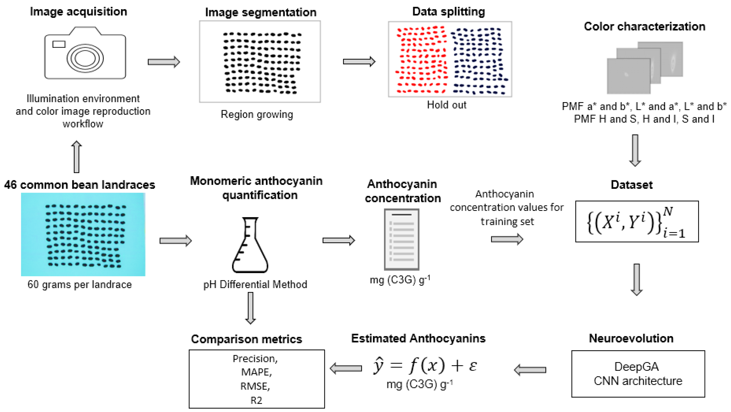 - Morales-Reyes, J.L.; Acosta-Mesa, H.-G.; Aquino-Bolaños, E.-N.; Herrera Meza, S.; Márquez Grajales, A. Anthocyanins Estimation in Homogeneous Bean Landrace (Phaseolus vulgaris L.) Using Probabilistic Representation and Convolutional Neural Networks. J. Agric. Eng. 2023, 54, 1–12. [Google Scholar] [CrossRef]