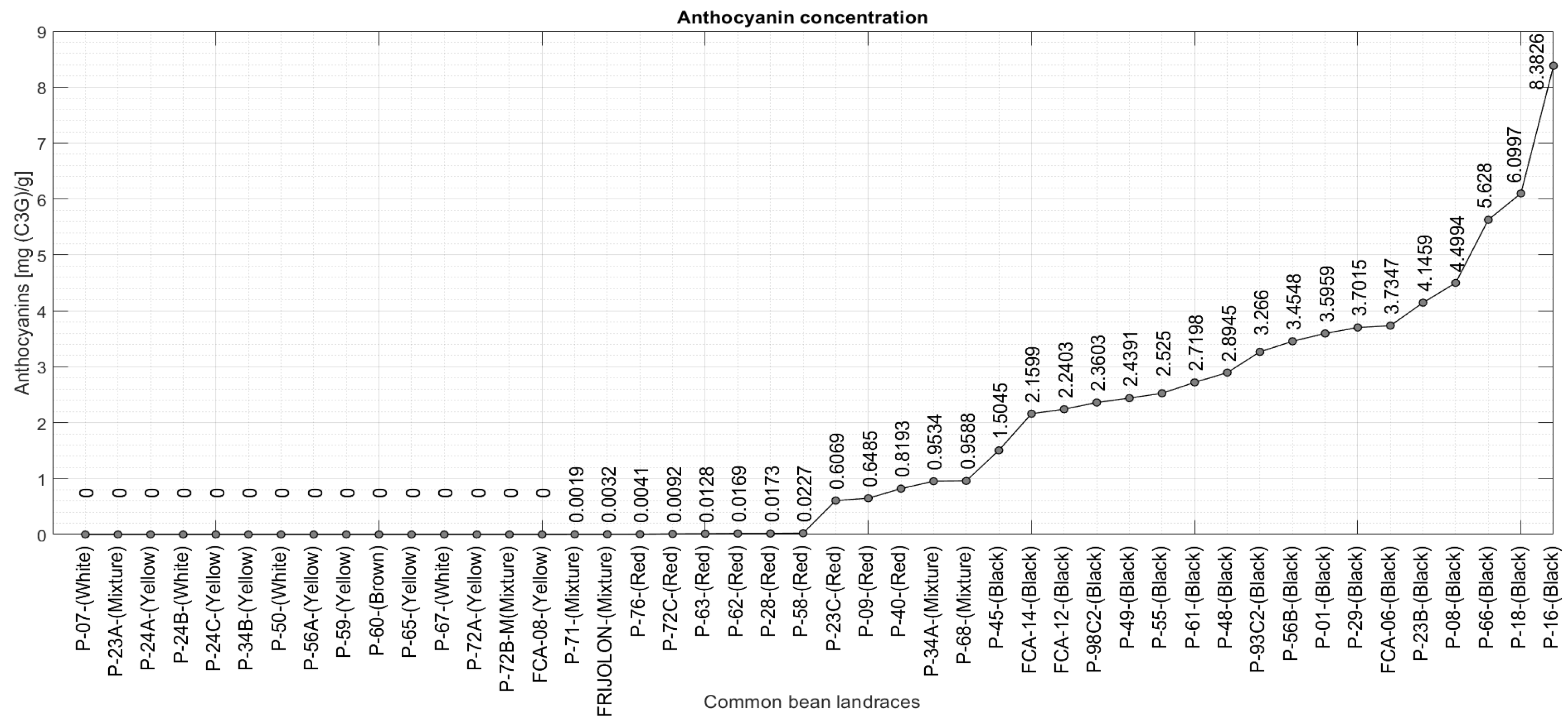 - Aquino-Bolaños, E.; Garca Daz, Y.; Chavez Servia, J.; Carrillo Rodrguez, J.; Vera Guzman, A.; Heredia Garcia, E. Anthocyanins, Polyphenols, Flavonoids and Antioxidant Activity in Common Bean (Phaseolus vulgaris L.) Landraces. Emir. J. Food Agric. 2016, 28, 581. [Google Scholar] [CrossRef]