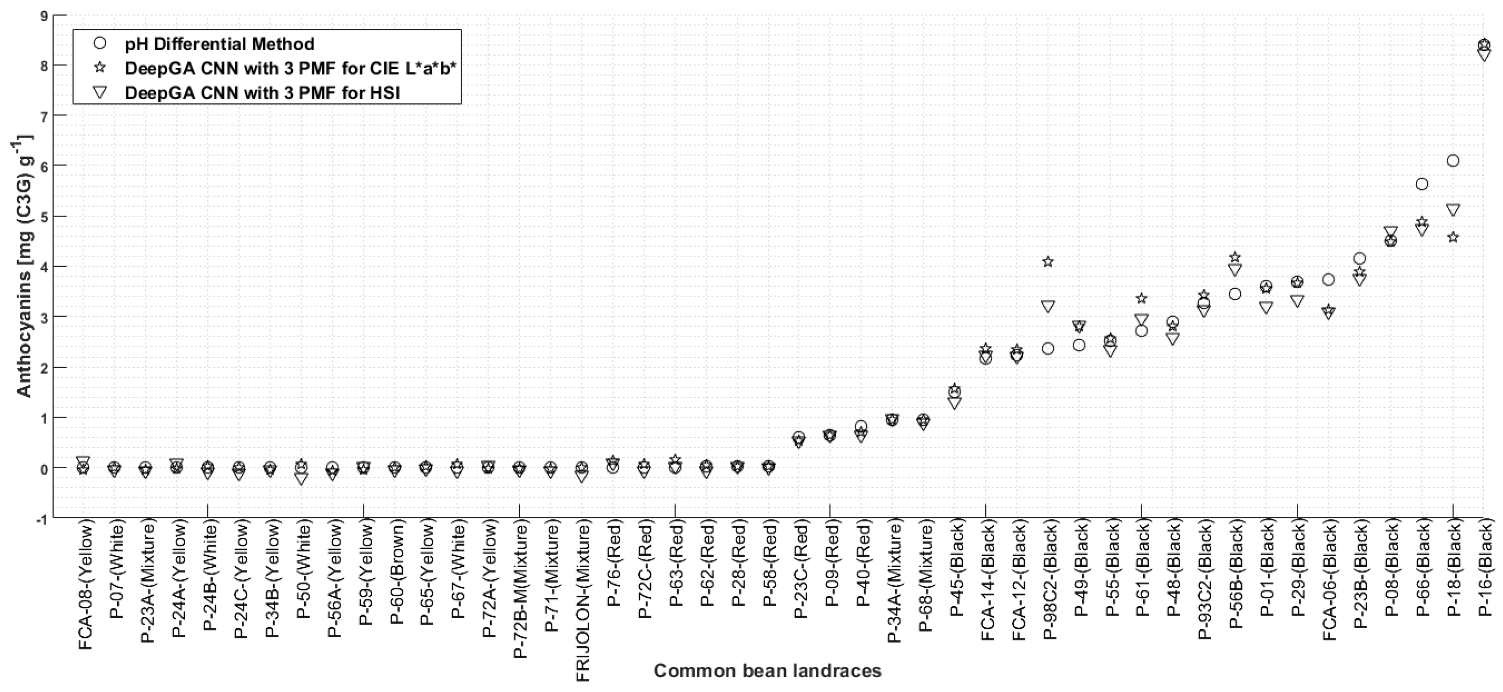 - Morales-Reyes, J.-L.; Aquino-Bolaños, E.-N.; Acosta-Mesa, H.-G.; Márquez-Grajales, A. Estimation of Anthocyanins in Homogeneous Bean Landraces Using Neuroevolution. In Advances in Computational Intelligence. MICAI 2023 International Workshops; Calvo, H., Martínez-Villaseñor, L., Ponce, H., Zatarain Cabada, R., Montes Rivera, M., Mezura-Montes, E., Eds.; Lecture Notes in Computer Science; Springer Nature: Cham, Switzerland, 2024; Volume 14502, pp. 373–384. ISBN 978-3-031-51939-0. [Google Scholar]