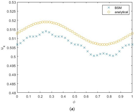 Velocity component ux parallel to the un-corrugated wall (along gravity) as a function of the parameter φ (phase of sin-type corrugation, see Equation (8)), and analytical solution (Ref. [3], p. 7) of the Stokes equations near the corrugated wall. The number of Stokeslets and number of collocation points per spherical particle: (a) N = 100, (b) N = 150, and (c) N = 200.