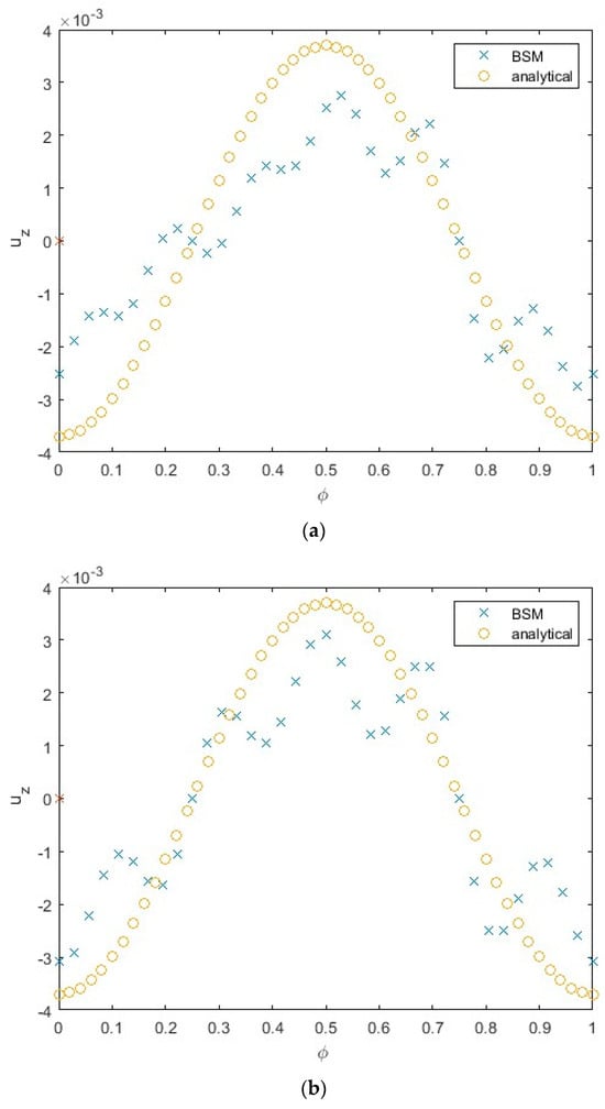 The results obtained by using a 10 × 10 x-y domain are very close to those obtained by a 15 × 15 domain, therefore, the results in Figure 4 are presented for a 10 × 10 domain. In Figure 4, the MFS results are presented for the following numbers of Stokeslets per sphere: N = 100 (Figure 4a), N = 150 (Figure 4b), and N = 200 (Figure 4c). The results for N = 150 are closer to the analytical solution compared to those for N = 100 (compare Figure 4a to Figure 4b). The results for N = 200 show the deviation from the analytic values with the increase in magnitude of the velocity, uz, for some values of φ. This can be explained by the dramatic increase in the condition number, c ~ 107, for N = 200. This value of the condition number is much larger than that for N = 100 (c ~ 650) and for N = 150 (c ~ 2300).
