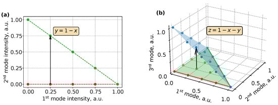 As an example of the working principle of the algorithm, we illustrate two simple cases where there are only  intensity levels. In the first case, which is depicted in Figure 1a, we consider  modes. Here, the hyperplane with all possible combinations boils down to a straight line. However, in the second case, where we consider three modes (), all combinations bounded by the line for  and marked by the green points (see Figure 1b) have to be projected to the plane  to obtain the set of amplitudes that satisfies the condition .