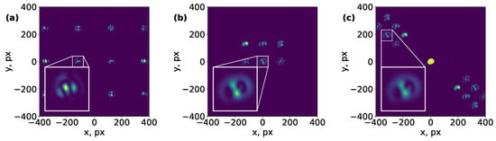 The final hologram (see Figure 2b) is obtained from the amplitude-phase function  by applying Equations (20), (21), and (23). An example of a captured image is shown in Figure 3b together with an enlarged area for one mode presented in the inset.