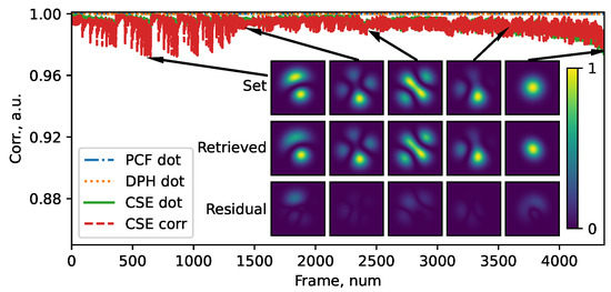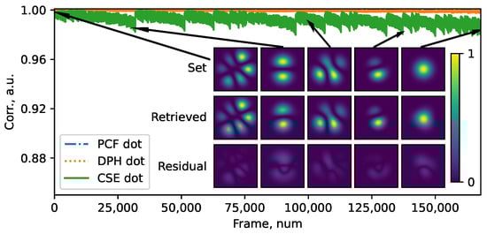 where  and  are the mean values of the matrices A and B, respectively, whose elements are  and , respectively. Here, the matrices represent pixelated frames containing initial and reconstructed beams. The cross-correlation parameter was calculated for the CSE method in the case of three and six modes (red line in Figure 4 and Figure 5). As can be seen, we found a similar behavior to that of the amplitude correlation calculated via the dot product (green line). This agreement allowed us to conclude that the CSE method is less accurate than DPH and PCF. Still, it has to be underlined that the CSE’s accuracy remains comparable to that of methods based on neural networks [].