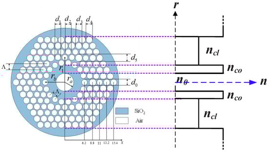Based on the concept of weakening the spin–orbit coupling effect introduced using a circular symmetrical structure and the feasibility of fiber drawing, a ring core OAM-PCF with hybrid cladding is proposed. Air holes of the first ring must be arranged as a circular ring to match the ring intensity distribution of OAM modes and ensure the OAM modes’ excitation. To lift the index separation and reduce the spin–orbit coupling, triangular lattice is introduced to break the circular symmetry. Therefore, a combination of the circular and triangular lattices is designed as the fiber outer cladding, as shown in Figure 1. The fiber base material is made of pure silica (refractive index is 1.444 at the wavelength 1.55 μm). The cross-section of the designed optical fiber consists of the inner cladding of a large central air hole, the annular core region supporting OAM modes, and the combination outer cladding of one-layer ring lattice air holes and the four-layer triangular lattice air holes []. ra is the radius of the central air hole, and rb and r1 are the distance from the center of the fiber to the center of the annular air holes and the second ring air holes with triangular lattice in the cladding, respectively. d0 is the diameter of the air hole in the innermost ring and d1–d4 are the diameters of the four layers of air holes arranged in a triangular lattice from inside to outside. The diameter of air holes at the six corners of the second ring arranged in a triangular lattice is d5, which can further break the circular symmetry of the optical fiber structure and weaken the spin–orbit interaction between OAM modes. is the pitch between the adjacent air holes in the triangular lattice. ΛC is the pitch between adjacent air holes in the ring lattice. Generally speaking, the larger the air filling fraction in the cladding is, the higher the index contrast between the fiber core and cladding. However, the stable structure of the fiber simultaneously needs to be considered; hence, the sizes of the air holes in the cladding should be a trade-off value. The structure parameters of the fiber are presented in Table 1. The thickness of the silica ring is 2.5 µm, which is a result of balancing the excitation of the high-order radial modes and the mode field quality. Therefore, the fiber belongs to the thick ring structure, which can provide high mode field quality and suppress the spin–orbit coupling effect [].