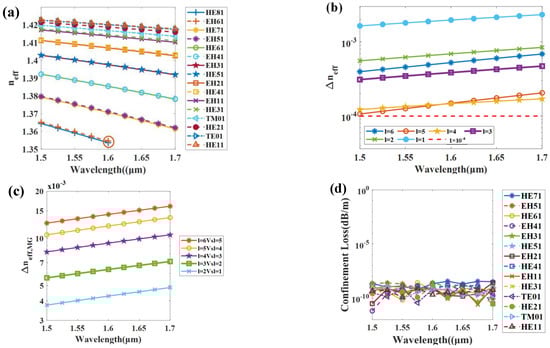 The number of OAM modes stably supporting the fiber is determined by the effective normalized frequency Veff of the fiber and the degree of the separation of the mode effective index between adjacent vector modes. The most direct way to increase the number of OAM modes is to increase the radius of the fiber core. The stable transmission of OAM modes requires that the effective refractive index difference should be larger than 10−4 between adjacent modes for MDM or larger than 10−3 among mode groups for mode group division multiplexing, which can help to implement free or few MIMO digital signal processing in the receiver of MDM systems. This is the third advantage of the OAM modes mentioned above. The effective refractive index of the vector modes of the proposed fiber is shown in Figure 2a, in which the cut-off wavelength of HE8,1 and EH6,1 is 1.6 μm. In our design of an OAM fiber with a wide bandwidth and high stability, these two modes are not discussed. Figure 2a indicates that 22 vector modes (six OAM mode groups) can be guided over a wavelength range of 1.5–1.7 μm (covering the whole C + L band). The effective refractive index of vector modes decreases with an increase in mode order and wavelength. There is an interesting phenomenon in Figure 2a: when l ≤ 4, the effective refractive index of HE mode in the same mode group is larger than that of EH, while, when l > 4, the situation is the opposite. Moreover, the effective refractive index separation of HE and EH modes in the same mode group increases with an increase in the wavelength. Therefore, in Figure 2b, it is shown that the effective refractive index difference of the vector modes in the same OAM mode group increases with an increase in wavelength, and that the smallest effective refractive index difference is still greater than 10−4, which can ensure the stable transmission of an OAM mode without coupling into LP modes. The effective refractive index difference between adjacent the mode groups is defined as