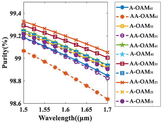 The purity can be used to express the spin–orbit coupling degree of the OAM modes supported in the designed fiber. The higher the mode purity is, the weaker the spin–orbit coupling. Here, the purity of OAM modes can be expressed as the power weight of the dominant component in all synthesized OAM beams []