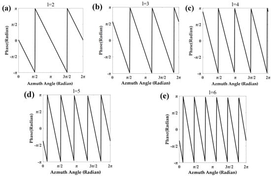 The phase variation of OAM modes with an increase in azimuth angle for (a) l = 2; (b) l = 3; (c) l = 4; (d) l = 5; (e) l = 6.