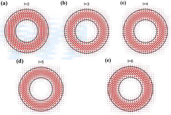 The phase characteristics of different order-synthesized OAM modes are shown in Figure 4. The phase varies periodically and uniformly with an increase in azimuth angular θ, which indicates that the purity of each order mode is high, corresponding to weak spin–orbit coupling effect. Figure 5 shows the polarization characteristics of the synthesized OAM modes, which can also be used to qualitatively analyze the purity and spin–orbit coupling effect of the OAM modes. The black circles are the inner and outer core boundary of the designed fiber, and the red ellipse represents the polarization characteristics of the OAM modes. The size of the ellipse indicates the energy amount. The closer the ellipse is to the circle, the higher the purity of the mode. The purity of the synthesized OAM modes is very high, which indicates that the fiber can suppress spin–orbit coupling.