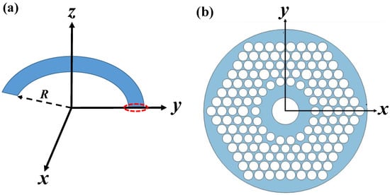 The bending model is bult as shown in Figure 6a. The fiber is bent around the Z-axis into an annular shape toward the X-axis with a curvature radius R, and the degree of bending gradually increases with the decreasing R. Figure 6b shows the cross-section of the designed fiber in Cartesian coordinates. The refractive index distribution of the fiber bent along the X-axis can be expressed as []