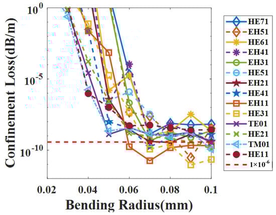 The confinement loss of all vector modes varies with the bending radius at 1.55 μm, as shown in Figure 7. All curves show similar trends, and the confinement loss for all the modes gradually declines as the curvature radius increases until they are equal to those of the confinement losses in the straight fiber. The change rates of the confinement loss are fast in the small bending radius region and then slow down when the bending radius becomes large. For the same mode, the larger the degree of bending is, the higher the confinement loss. The confinement loss of all vector modes is still less than 10−7 dB/m when the bending radius is larger than 0.8 mm, indicating that the designed fiber has good bending resistance. At the same bending radius, the bending losses of the higher order modes are greater than that of the lower order modes, which implies that the high order modes will firstly leak out the fiber core when fibers are bent to an extent. Here, we exhibit the ultimate bending loss of the designed fiber. However, it is almost impossible for the optical fiber to reach such a bending radius in practical applications. Therefore, the bending loss of the fiber can be ignored in practical applications, which is an advantage of the designed fiber.