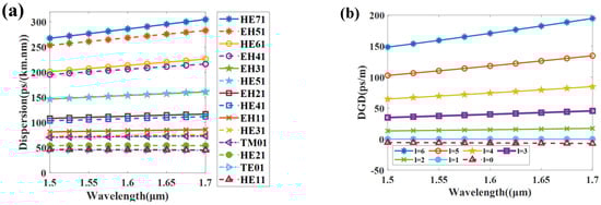 where Re(neff) is the real part of the effective refractive index of the vector mode, λ is the wavelength of incident light, c is the velocity of light in the vacuum. The total dispersion is the sum of waveguide dispersion and material dispersion. The material dispersion is calculated using the Sellmeier dispersion equation. As shown in Figure 8a, the dispersion of all vector modes increases slowly with an increase in the wavelength, and the dispersion variation is less than 50.0 ps/nm/km in the wavelength range of 1.5–1.7 μm, indicating that the designed fiber has a relatively flat dispersion, especially in the C + L band.