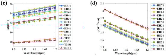where n2 is the nonlinear refractive index of the material with a value of 2.3 × 10−20 m2W−1. As shown in Figure 8d, the nonlinear coefficients of all vector modes are less than 2.0 W−1/km and decrease with an increase in wavelength.