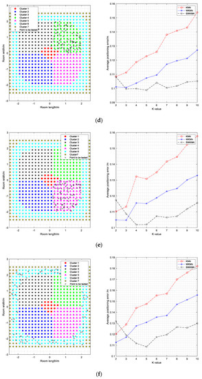 Through cross-validation, the algorithm and k value with the best positioning effect in each cluster are determined. We summarize the results of Figure 9 and present them in Table 2. It can be seen that from the center of the room to the edge, the average positioning error increases from small to large, and the error in each area has been reduced using the clustering algorithm.