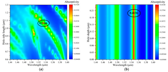 Figure 7a, as the side length increased, the absorption peaks gradually converged towards the range of 1530–1550 nm. Under a constant side length and period, as the depth increased, the absorption peak behaved similarly to the case of varying side length, as shown in