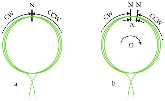 A fiber coil rotating with a clockwise angular velocity: (a) the different optical paths of the clockwise (CW) and counterclockwise (CCW) optical beams, (b) the same difference Δl between the optical paths of the clockwise and counterclockwise beams due to rotation, along with the stationary optical path.