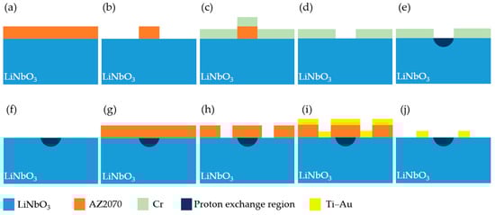 MIOC fabrication steps: (a) AZ2070 spin coating, (b) photoresist patterned using waveguide mask, (c) Ti coating, (d) lift-off process, (e) proton exchange process, (f) Ti etch and annealing, (g) AZ2070 spin coating, (h) photoresist patterned using electrode mask, (i) Ti–Au coating, and (j) lift-off process.