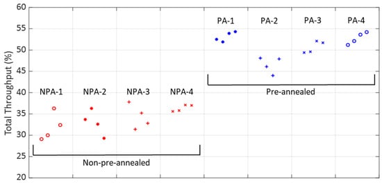 Scatter plot comparison of total throughput measurements for MIOCs fabricated on non-pre-annealed and pre-annealed wafers.