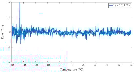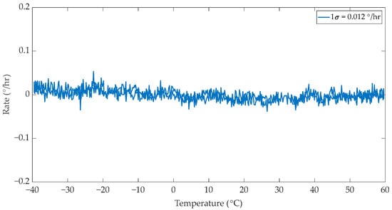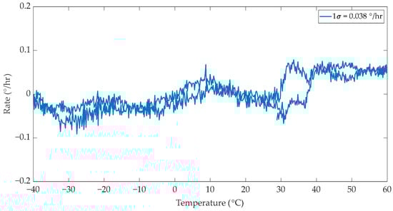 The fourth and final test was run using a MIOC fabricated on the pre-annealed PA-4 wafer. The test results are presented in Figure 9. It was observed that this MIOC exhibited a 1σ value of 0.019°/h, with small bias fluctuations. The bias drift was insignificant in this test. The peak in the bias value observed around −32 °C was caused by the environmental factors present during the testing process, such as vibrations affecting the measurement setup, which was placed outside the climate chamber.