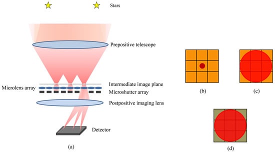Figure 1a presents a schematic diagram of an FOV-gated optical imaging system that utilizes a microlens and microshutter array. This system comprises three primary components: a prepositive telescope featuring a telecentric beam path in the image space, a microlens and microshutter array, and a common postpositive imaging lens. The prepositive telescope is characterized by a large aperture, a wide FOV, and a short focal length, enabling it to collect light from multiple stars and form images on the intermediate image plane. The microshutter and microlens array serve to gate a narrow instantaneous FOV of the prepositive telescope. The postpositive imaging lens, in conjunction with the microlens elements, forms a magnifying imaging system that enhances the stellar images on the intermediate image plane. Each microlens element is aligned such that its optical axis is parallel to that of the postpositive imaging lens, resulting in the creation of multiple imaging channels within the system. Through the rapid switching of the gated FOV by the microshutter array, the stellar images on the intermediate image plane can be gated swiftly, allowing the magnified stellar images to be recorded by a common detector. If the switching frequency is sufficiently high, this system can be regarded as the simultaneous detection of multiple stars within a wide FOV during the daytime.