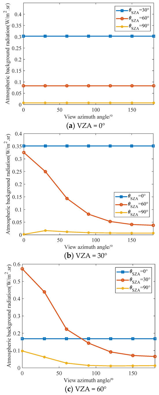 The calculation of sky background radiation is considerably more complex than that of stellar signals due to the significant influence of various observational conditions, including observation height, observation direction, solar zenith angle, and other relevant parameters. Generally, the sky background radiation under varying observational conditions can be simulated and analyzed using PcModWin 6 software based on the MODTRAN model []. For an airborne platform, the observation height is approximately 3 km and above. Figure 2a–c illustrate the relationship between sky background radiation within the wavelength range of 1.3 μm to 1.7 μm and the view azimuth angle (VAA) at different solar zenith angles, with view zenith angles (VZAs) set at 0°, 30°, and 60° when the observation height is 3 km, respectively.