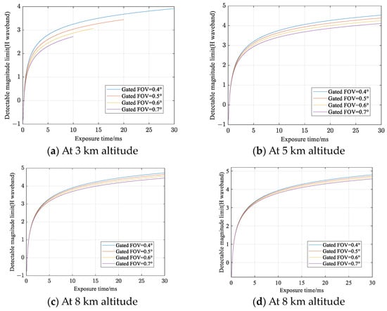 As altitude increases, the background radiation of the sky diminishes, resulting in an extended maximum exposure time. According to Formula (19), the maximum exposure time for various gated FOVs exceeds 40 ms at an altitude of 5 km and reaches up to 100 ms at altitudes above 8 km. While it is possible to observe fainter magnitudes, prolonged exposure times may lead to the drift of star spots on an airborne platform. Figure 3b–d illustrate the detectable magnitude limit for different gated FOVs at a maximum exposure time of 30 milliseconds, corresponding to altitudes of 5 km, 8 km, and 10 km, respectively. It is observed that a larger gated FOV correlates with a brighter-detectable-limit magnitude. However, as altitude increases, the impact of the gated FOV on the detectable limit magnitude diminishes. Notably, at altitudes exceeding 5 km, the detectable magnitude limit consistently exceeds the fourth magnitude in the H-band.