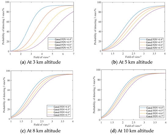 As illustrated in Figure 4, to achieve an 80% probability of detecting three stars at an altitude of 3 km, the total FOV of the system should exceed 3.8°, 4.8°, 5.8°, and 7° for gated FOV values of 0.4°, 0.5°, 0.6°, and 0.7°, respectively. When the gated FOV is held constant, the required total FOV progressively decreases as altitude increases. Specifically, when the gated FOV is set at 0.4° and the total FOV is 3.8°, a minimum probability of 80% for detecting three stars can be achieved at altitudes of 3 km and above. It is noted that the duty cycle of the FOV cannot reach 100%. Assuming a duty cycle of 0.6 [], the total FOV should not be less than 6.3°.