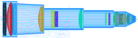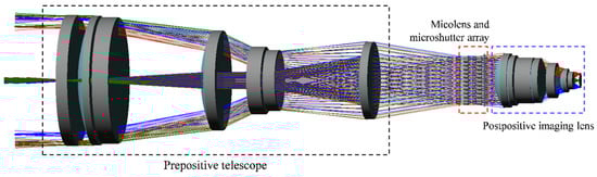 Based on the above analysis, an FOV-gated optical imaging system was designed, as illustrated in Figure 5. The operational wavelength range of the imaging system spans from 1.3 μm to 1.7 μm. The specifications of the prepositive telescope include an aperture of 100 mm, a focal length of 300.83 mm, and an FOV of 7°. To enhance design flexibility for optimizing imaging quality and to improve the duty cycle of the FOV, a microlens array comprising both a front microlens array and a rear microlens array was developed. Each microlens features an aperture of 3.5 mm, with a focal length for the microlens group of 9.14 mm, resulting in a gated FOV of 0.4° for each microlens group. The aperture of the postpositive imaging lens measures approximately 41.92 mm, with a focal length of 45.25 mm. The combination of the microlens group and the postpositive imaging lens yields a magnified imaging system with a magnification factor of 4.95. Additionally, the microshutter array is positioned 2 mm behind the microlens array group, with each microshutter element also having an aperture of 3.5 mm. The total focal length of the entire optical system is 1489 mm. The principal parameters of each optical element within this optical imaging system are detailed in Table 3. Notably, the conic constant of the 28th surface is −0.6114, while the coefficients for the 4th-, 6th-, 8th-, and 10th-order terms are −1 × 10−4, 1.1813 × 10−5, −2.2296 × 10−7, and 1.4815 × 10−9, respectively.