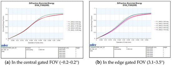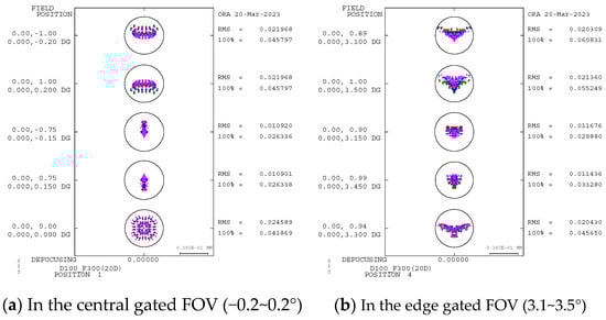 The imaging quality of the designed FOV-gated optical system is assessed through the analysis of spot diagrams and energy concentration. Figure 6a,b illustrate the spot diagrams of the stellar images within the central gated FOV (−0.2~0.2°) and the edge gated FOV (3.1~3.5°), respectively. The root mean square (RMS) radii of the spot diagrams for each gated FOV are all less than the Airy radius, indicating that near-diffraction-limited imaging is achieved across all gated FOVs.