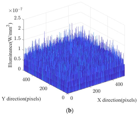 Figure 10a illustrates the illuminance produced by a 0-magnitude star with a 0° incident angle on the out-of-focus detector of the prepositive telescope imaging system, as determined through simulation. It is evident that the stellar image is distributed across a 3 × 3 pixel array, with an average illuminance value of approximately 6.96 × 10−10 W/mm2. Figure 10b depicts the illuminance resulting from sky background radiation, characterized by a radiant intensity of 0.35 W/m2·Sr, on the out-of-focus detector. The average illumination value on the detector is found to be approximately 2.13 × 10−8 W/mm2.