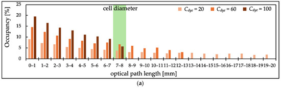 Figure 8 shows the PL distribution at 426 nm (high absorption peak) ranging from 0 to 20 mm, divided into 1 mm intervals. Without scatterers, the distribution predominantly concentrates around the cell’s diameter [Figure 8b], whereas the addition of scatterers results in a significantly broader PL distribution [Figure 8a]. Moreover, in samples with added scatterers, as Cdye and consequently µa increase, it is observed that the PL distribution shifts toward shorter distances. This shift is thought to occur because, in cases of high µa, the transmitted light becomes too weak unless the PLs are sufficiently short. This result indicates that the addition of scatterers ensures the presence of sufficiently short light paths, allowing for the accurate measurement of absorbance spectra without a flattening of peaks, even in high-absorption areas. In contrast, in samples without scatterers, the distribution is observed to be within the 0 to 1 mm range, but this predominantly includes light that has reflected off the surface of the cell, essentially resulting in zero PL. Light with zero PL does not contribute useful information about the sample’s absorption and behaves as stray light.