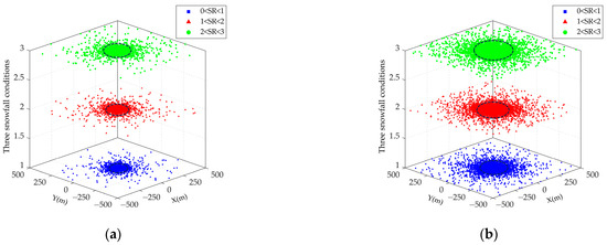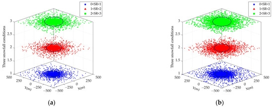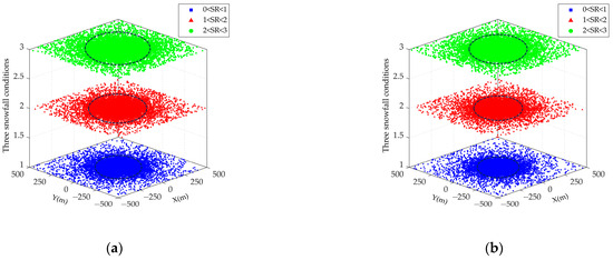 Ranting Tao et al. [14] obtained the PSD curves of snow in the range of three snowfall rates (SRs) (mm/h) by using data measured by a 2-DVD and fitted the PSD curves to obtain the snow particle size distribution model, as shown in Figure 1: