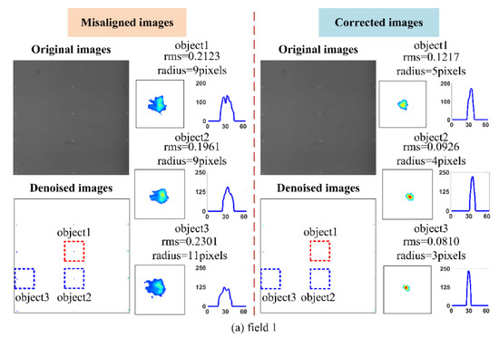 Root mean square radius (RMS) and radius of misaligned and corrected images.