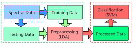 Training and predicting procedure of the algorithm’s processing module. The LDA algorithm preprocesses the spectral data and inputs them into the SVM classifier. From [].
