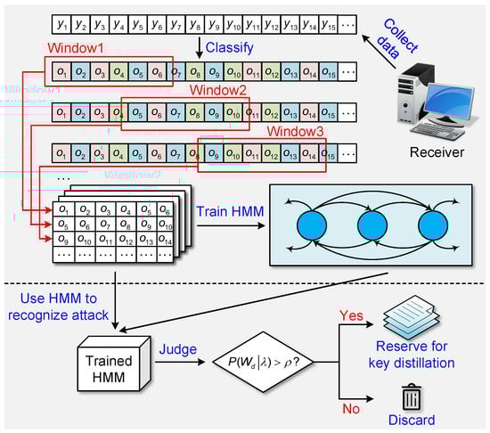 After analysis, Mao et al. [] found that the variation of the measured quadrature values reflected whether the calibration attack was performed. However, Bob’s measurement values are affected by environmental disturbances, the drawbacks of devices, and the attacks by eavesdroppers. Based on this, Mao et al. established an HMM-based calibration attack recognition, which sufficiently analyzes training data only influenced by common interferences but eavesdroppers. If Eve launches the calibration attack, the trained model will detect the interference values according to the changed quadrature values of Bob’s measurement. The whole procedure has two parts, as illustrated in Figure 2. The offline training process is the top-half part above the dotted line, while the recognition process is the bottom-half part below the dotted line. During the training, Mao et al. collected the normal dataset of previous communication processing by the peak–valley-seeking method and then trained the parameters of the HMM with the Baum–Welch algorithm. Normally, a well-trained HMM will output a high probability value for normal data and a low probability value for attacked data. When the predicted probability value is smaller than a certain threshold, the system is attacked and the received attacked sequences are discarded. The HMM-based calibration attack recognition can precisely detect almost all of the attacked data under 30 km with a high recognition precision of 98.735%. According to this idea, if the unattacked training data under the condition of a certain attack can be collected, this proposed model also applies to the analysis of other attacks.