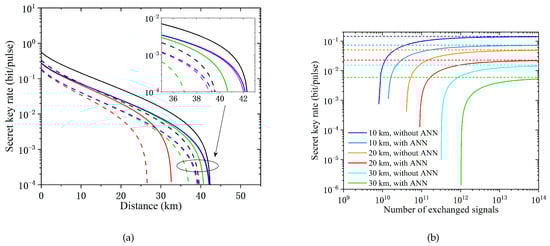 (a) The secret key rates against collective attacks under the asymptotic and finite size case. The solid lines represent the system performance without any countermeasures, and the dashed lines represent the system performance with the ANN-based attack detection model. From left to right, the curves represent the number of exchanged signals, N = , N = , N = , and N = , and the asymptotic case, respectively. (b) Composable secret key rates of a CVQKD system with and without the ANN-based attack detection model. The solid lines from left to right represent the composable secret key rates with and without the ANN-based attack detection model at transmission distances of 10 km, 20 km, and 30 km, respectively. The dashed lines with the same color as the solid lines are their corresponding asymptotic secret key rates under the same conditions. In all the simulations, the insertion loss of the AM on Bob’s signal path was set to a typical value of 2.7 dB. From [].