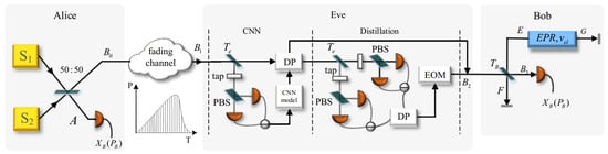 In Section 3.1, we introduced several cases of how to exploit machine-learning techniques to perceive one certain or several typical attacks, thereby restoring the high-accuracy and robust defense performance in CVQKD systems. We now discuss the machine-learning application to enhance the success rate of a quantum hacking attempt. Huang et al. [] demonstrated a convolutional neural network (CNN)-based entanglement distillation attack in the horizontal link GMCS-CVQKD system, in which the CNN can help Eve choose the best opportunity to launch the entanglement distillation attack.