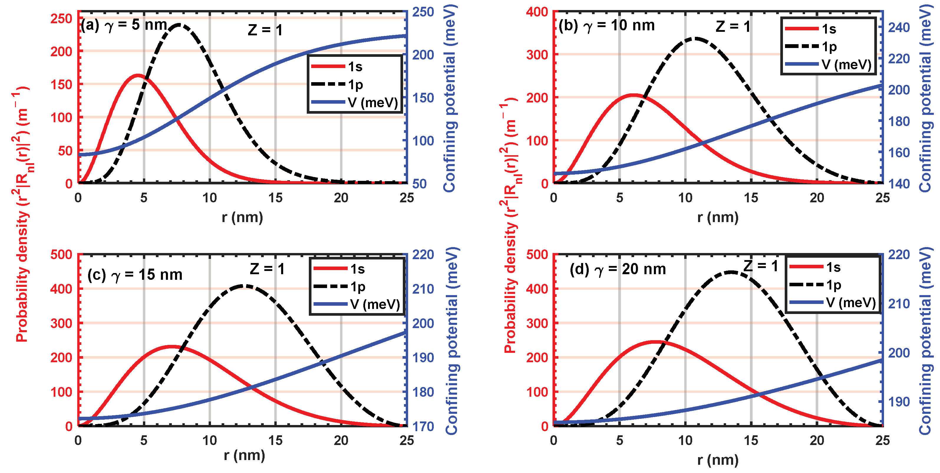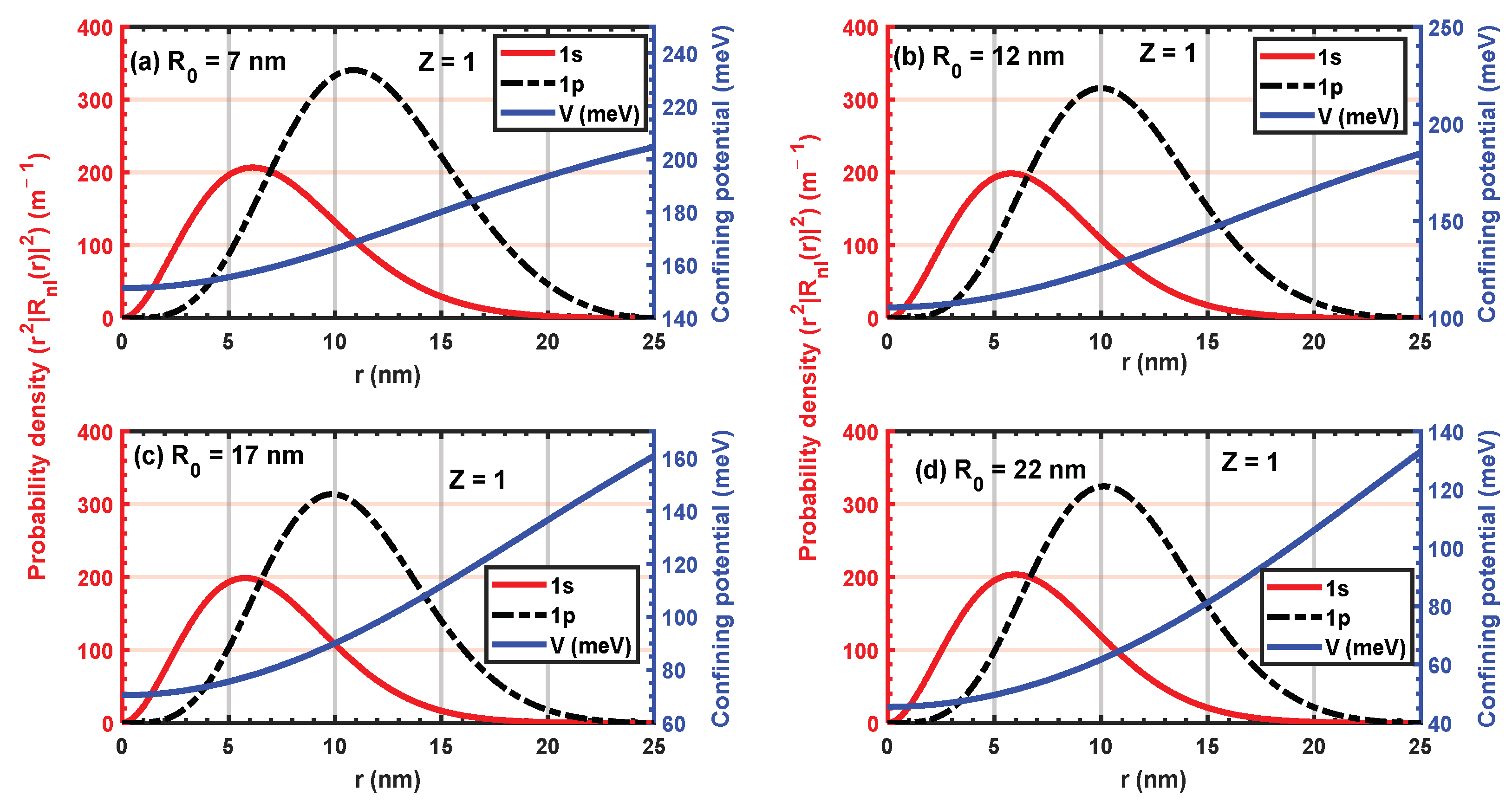 - Dakhlaoui, H.; Belhadj, W.; Musa, M.O.; Ungan, F. Binding energy, electronic states, and optical absorption in a staircase-like spherical quantum dot with hydrogenic impurity. Eur. Phys. J. Plus 2023, 138, 519. [Google Scholar] [CrossRef]