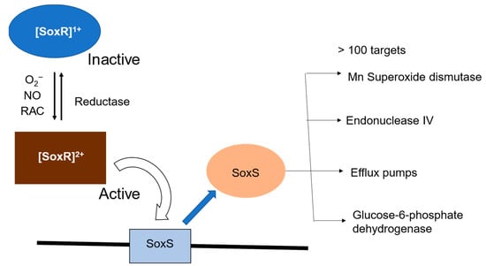 The target of activated SoxR is a single adjacent soxS gene. Increased SoxS levels induce expression of various antioxidant proteins and repair proteins []. This two-step soxRS-based regulatory mechanism controls the expression of genes encoding antioxidant defense proteins such as Mn-containing superoxide dismutase (SOD), glucose-6-phosphate dehydrogenase, endonuclease IV, and outer membrane drug efflux pump, as shown in Figure 1.