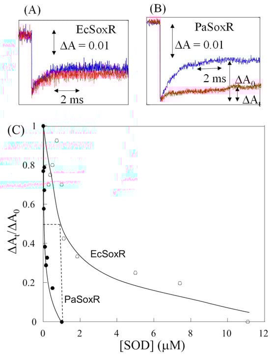 SOD effects on the oxidation of SoxR. Changes in absorbance measured after pulse radiolysis of EcSoxR (A) and PaSoxR (B) in the absence (blue line) or presence (red line) of 0.5 μM SOD. (C) The absorbance changes of (o) EcSoxR and (●) PaSoxR at time (∆At), normalized to the total absorbance change (∆A0) plotted against the concentration of SOD, Reprinted from [].