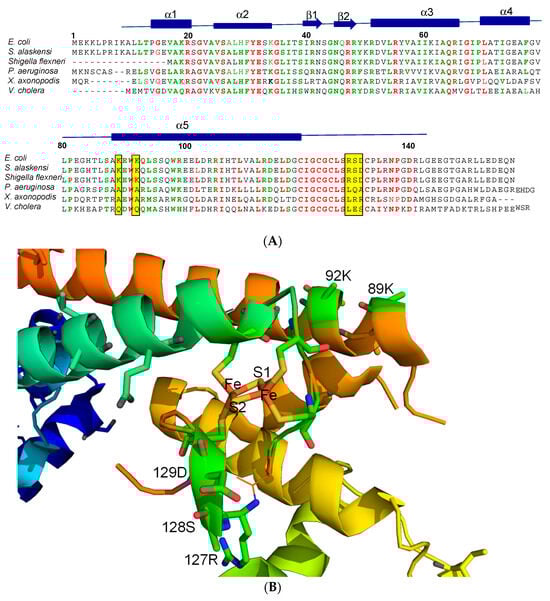 (A) Sequence alignments of SoxR proteins from enterics E. coli, Sphingopyxis alaskensis, and Shigella flexneri and non-enteric (P. aeruginosa, Xanthomonas axonopodi, Vibrio cholerae) bacteria. Identical and conserved residues among SoxR proteins are denoted in red and green, respectively. Hypervariable residues and the hypervariable motif are highlighted in yellow. (B) Structure of EcSoxR in the region near the [2Fe-2S] cluster. The structure was produced with PyMol using a structure from the Protein Data Bank (entry 2ZHG). Reproduced from []. Copyright 2016 American Chemical Society.