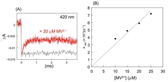 (A) Changes in absorbance at 420 nm after pulse radiolysis of PaSoxR. Samples contained 70 μM PaSoxR, 20 mM potassium phosphate buffer (pH 7.0), 10 mM potassium/sodium tartrate, 0.5 M KCl, and 0.1 M t-butanol, to which 20 μM MV2+ was further added in red colored. (B) Concentration dependence of MV2+ versus kapp in PaSoxR.