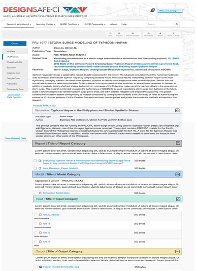 Our goal in the data design was to reflect how simulation researchers conceptualize their investigative process so that curation in the platform felt intuitive, intertwined with active research processes, and that the publication represented the work accomplished. Aided by the simulation requirements team experts, the data design was completed using diverse research and development methods including modeling research narratives, and iterative interface development and testing. In the design, we embedded lifecycle curation best practices such as: enabling paths between active, curated, and public data; recording data provenance; the possibility to add general and domain specific metadata; assuring long-term data permanence; and implementing different data navigation strategies to facilitate access. A main concern was designing for big data, so that managing large numbers of files is not a burden. Integrating curation and simulation services was also key and required balancing curation and publishing workflows with computational functionalities through the platform’s underlying data management technology. Flexibility and consistency in data representation were also important. While simulation researchers use diverse types of software and their datasets result in unique structures, across projects, curation functionalities and the general look and feel of the publications landing pages are the same. Beyond the technical challenges, achieving a seamless research flow within the platform required blending differences in professional practices and expertise. This needed a strategy to effectively involve the natural hazards experts in the data design. We captured and bridged the knowledge of experts and technical staff through a unique simulation data and metadata model and interactive mockups that were used to show and tell.