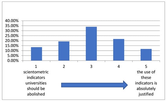 At the end of the general survey, respondents were asked to evaluate the attitude toward using scientometric indicators in universities on a scale from negative to positive in the range from 1 to 5. The results are as follows: 1: 13.5%, 2: 19.2%, 3: 33.9%, 4: 21.7%, 5: 11.7%. Summing up the negative and positive responses, we get 32.7% and 33.4%, which indicates that the number of respondents who are sympathetic to using scientometric indicators is only 0.7% higher than the number of opponents of this practice. This information is presented in Figure 1.